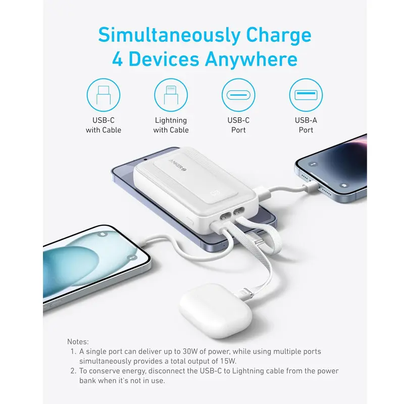 پورتهای متنوع: این مدل مجهز به کابلهای داخلی USB-C و لایتنینگ و همچنین پورت USB-A است که امکان شارژ همزمان ۴ دستگاه را فراهم میکند.
